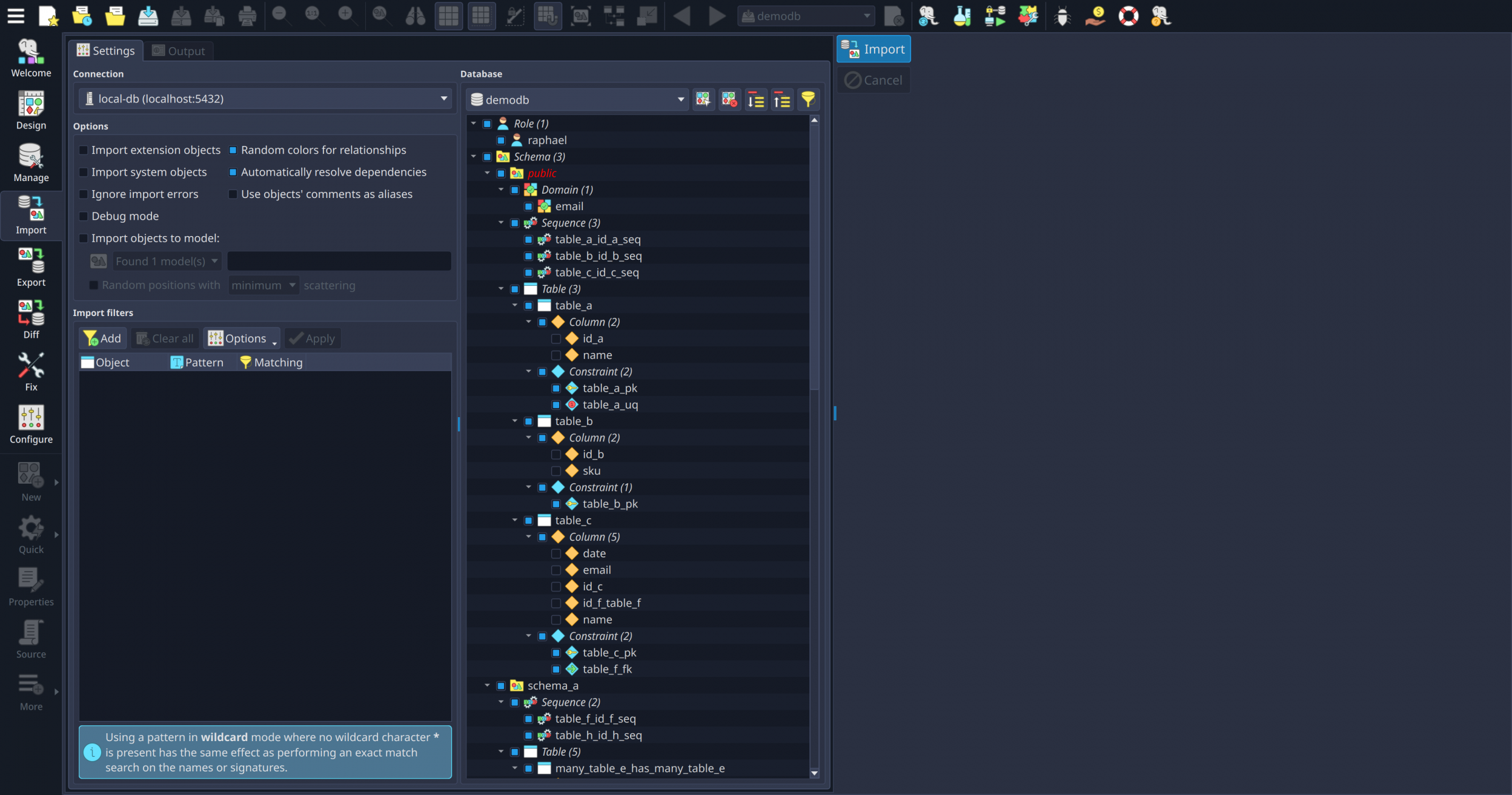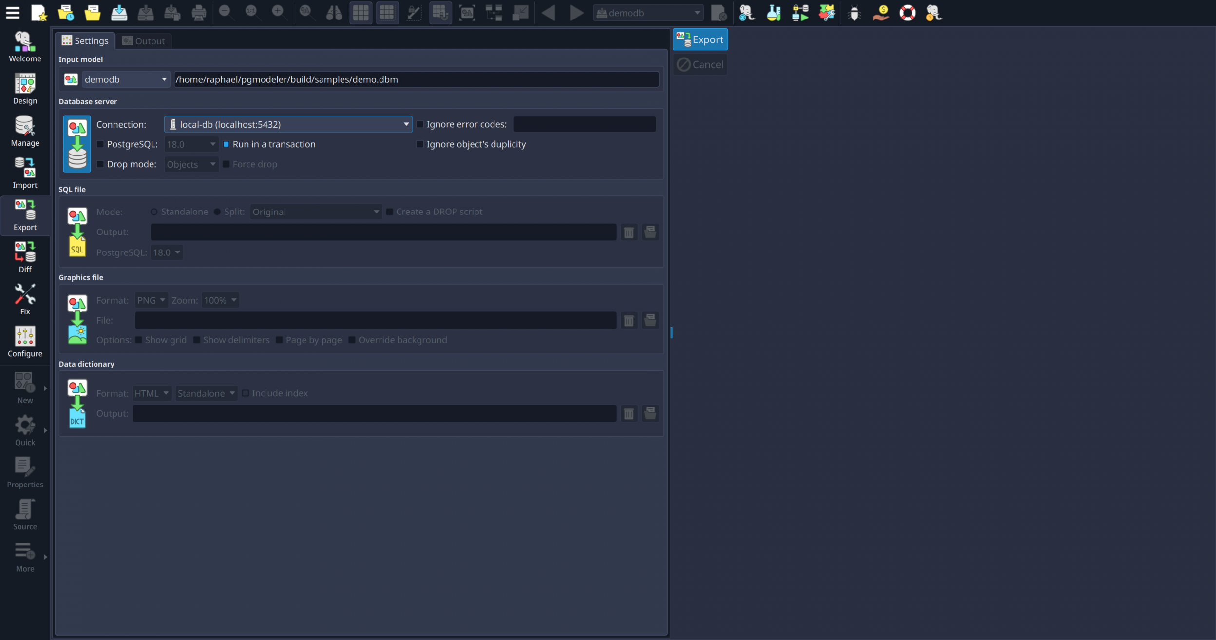 Following the same approach as the diff tool, the import and export tools received substantial improvements. Users can now freely choose any loaded model to perform operations, no longer limited to the active model. The model export widget was reorganized to include the new model/database selector, while mode selection buttons were replaced with more practical and consistent tool buttons. During export and import operations, the involved models are locked to prevent accidental modifications.