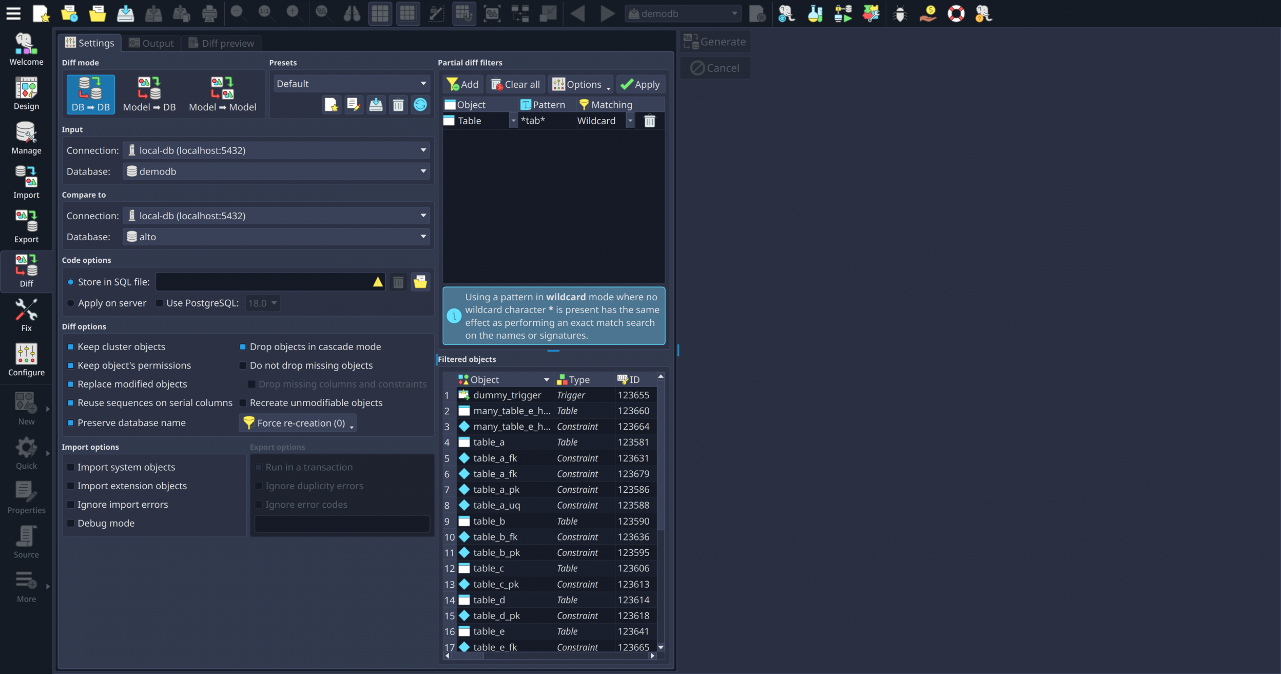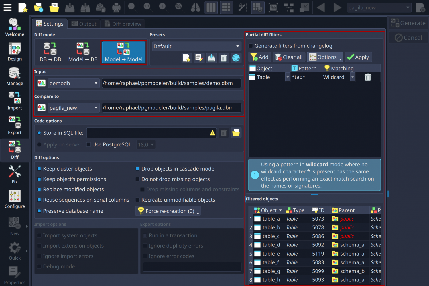 The diff tool received significant attention in this release. Users can now compare two loaded models without requiring a database connection, generating the corresponding SQL diff code for later usage. This new mode expands the tool's usability.